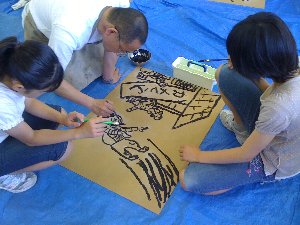 6月14日15日に子どもたちの描いた下絵を、大型紙芝居用の段ボールに写しまし